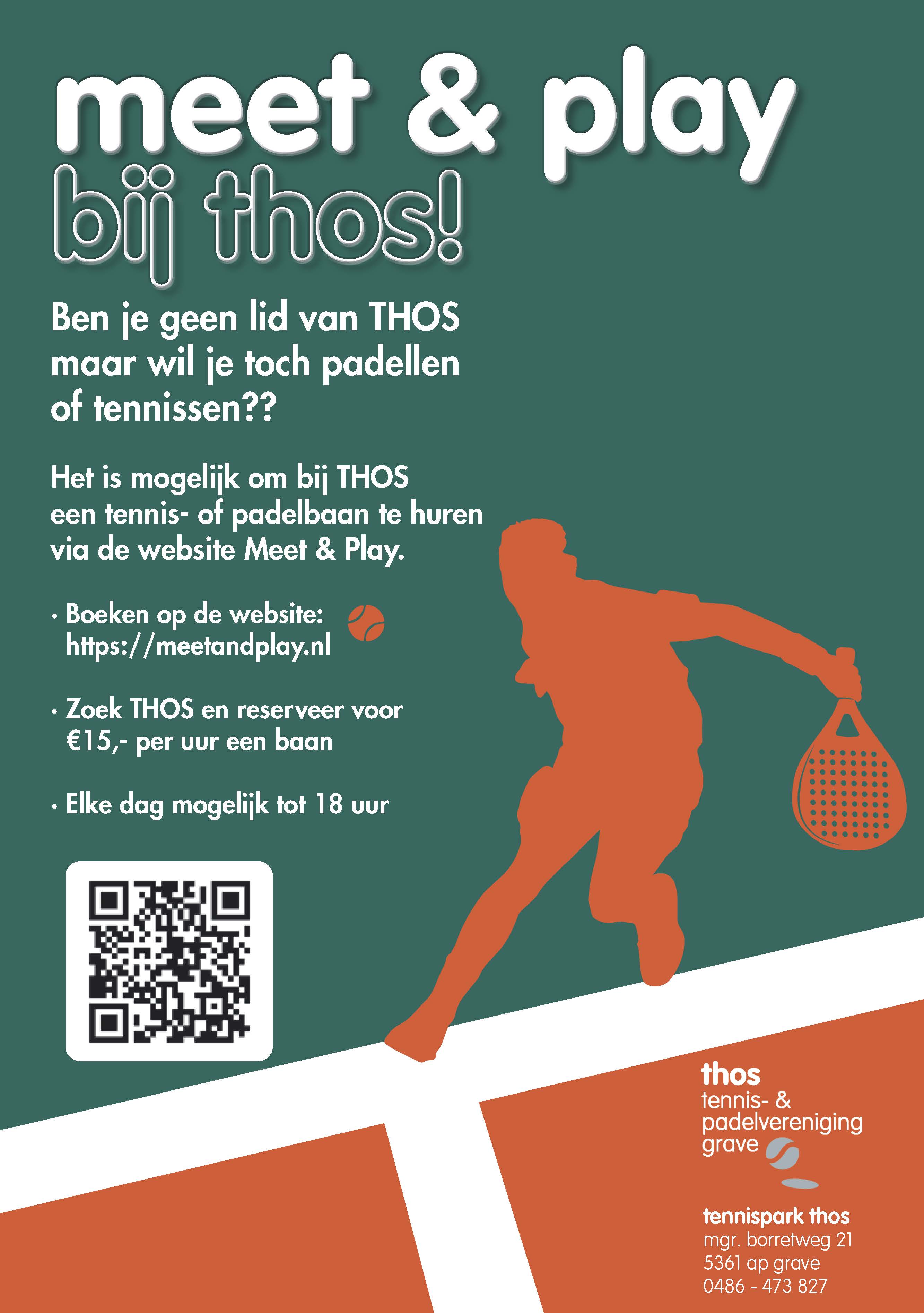 Wil je een keer met vrienden of familie een potje tennissen of padellen, dan kun je ook een tennis- of padelbaan huren met je introducées via de website Meet & Play https://meetandplay.nl Voor leden kan dat tegen een voordelig tarief van €15,00 per uur.
